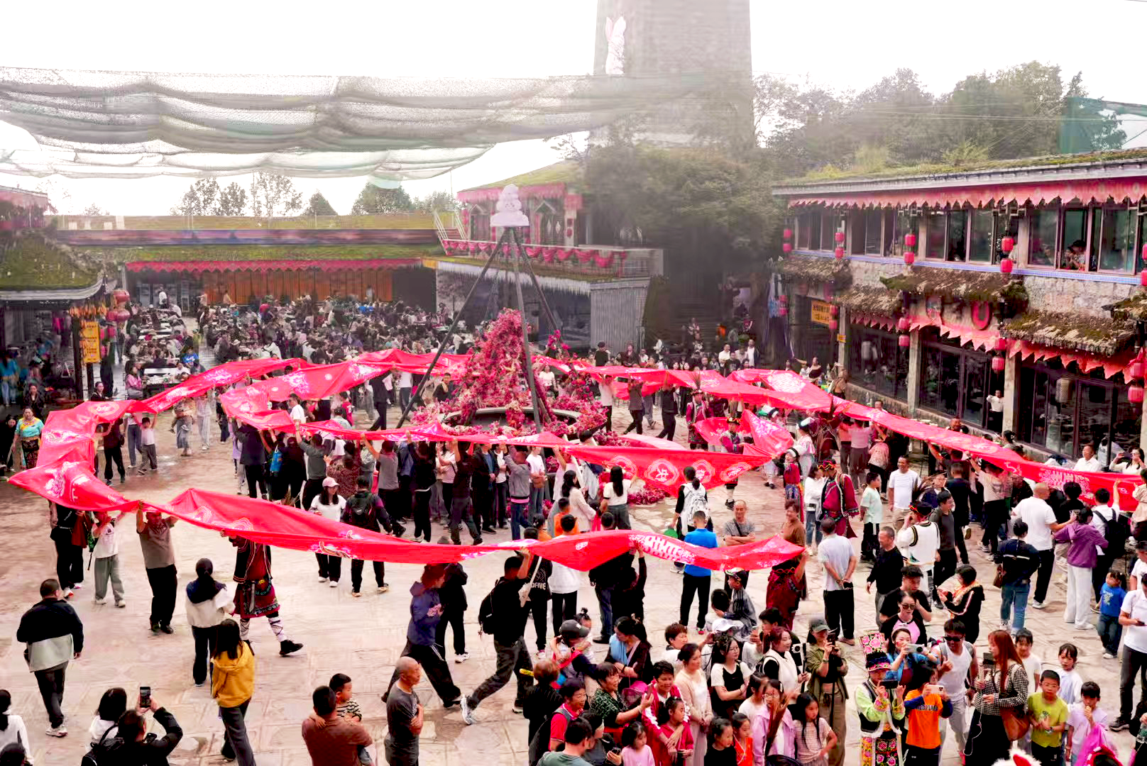 “清凉凉的咂酒勒……”10月5日,在曲山镇石椅羌寨,羌红飘扬,来自重庆的游客吴女士和家人们沿石阶向上。抵达寨门口,身着民族盛装的羌族同胞热情地为每位客人系上象征吉祥的红绸带,并敬上一杯醇香的咂酒。夜幕低垂,羌寨广场上,篝火与羌歌羌舞交相辉映,男女老少围着篝火欢快地跳起沙朗……游客沉醉于浓郁的羌风羌韵中,流连忘返。